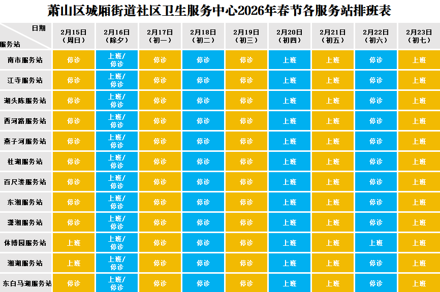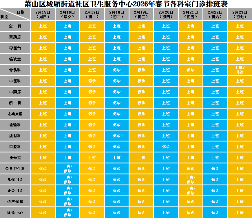 注:除全科門診、西藥房、輸液室、掛號室外,其余科室16日(大年三十)上午上班,下午休息;服務站排班詳見線下公告。