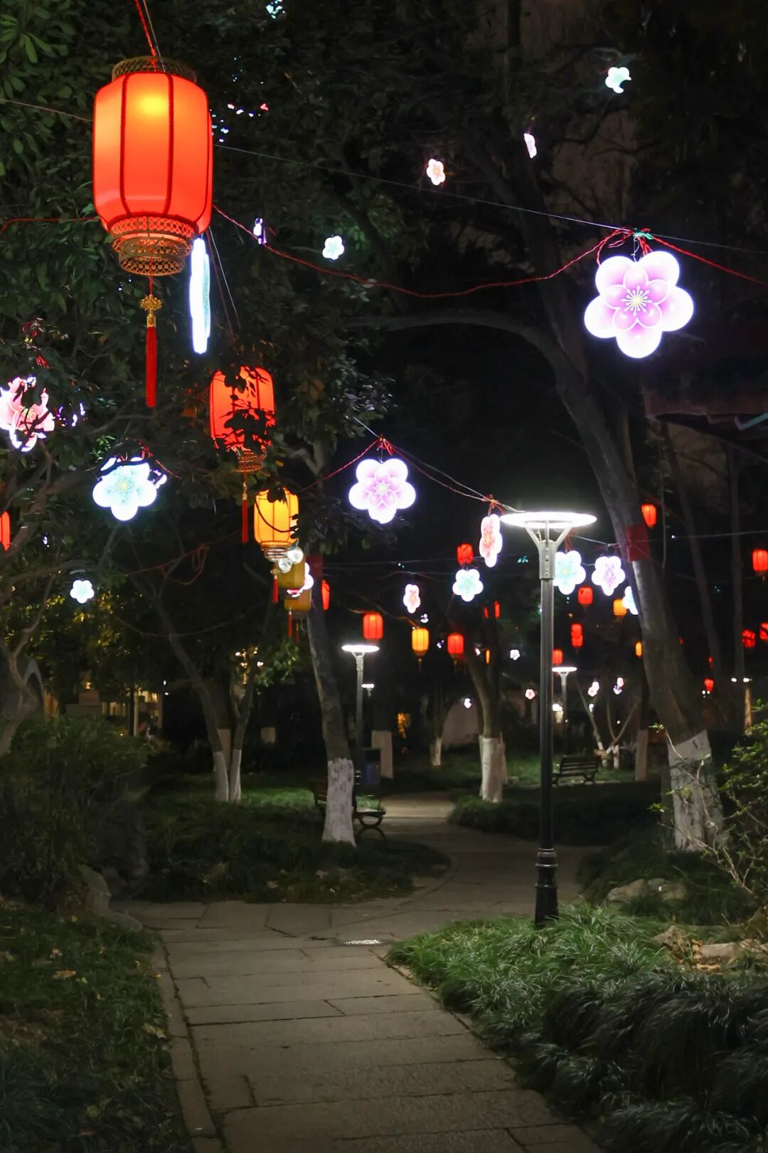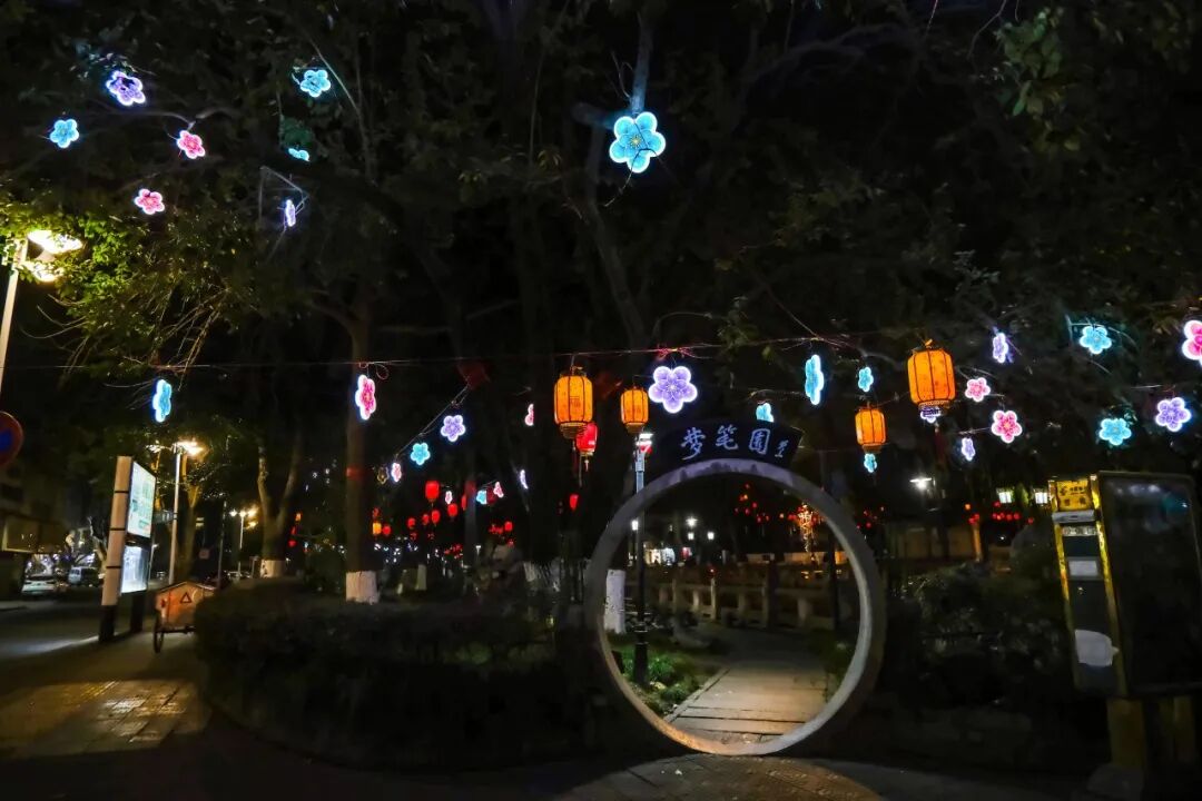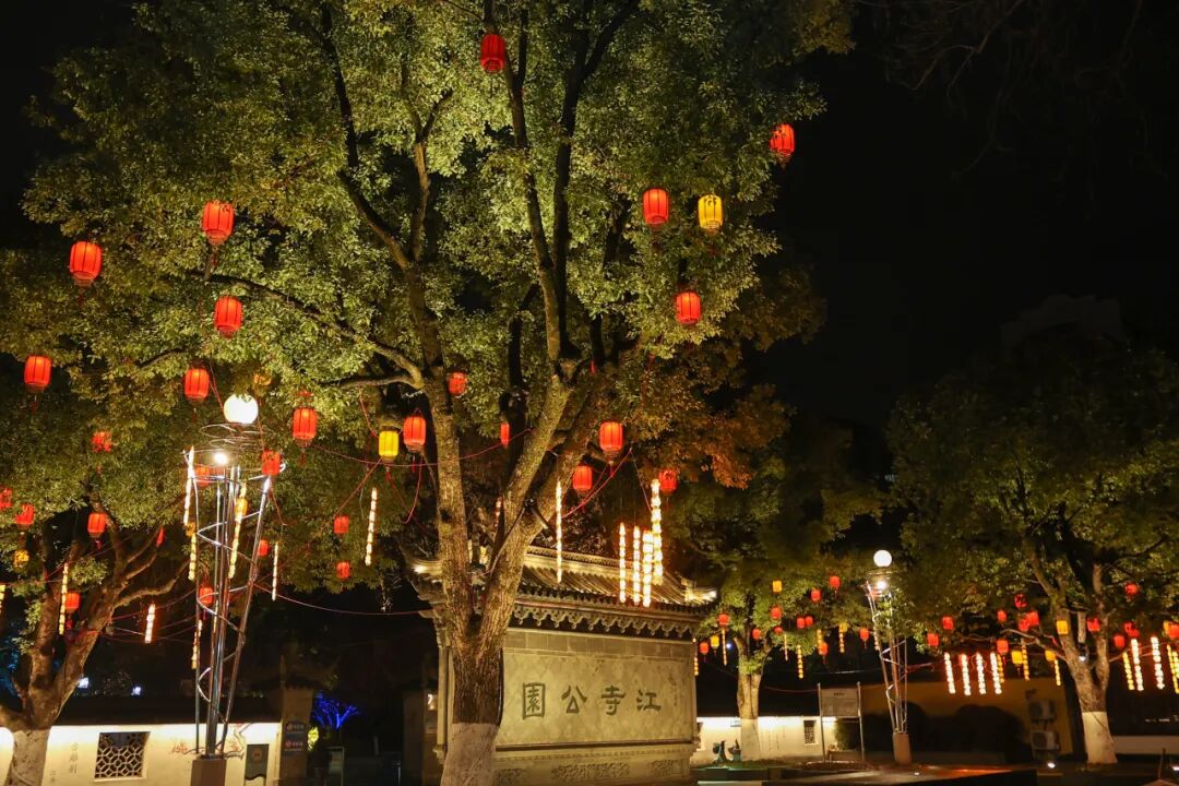 江寺公園南門,紅燈籠與詩詞燈牌高高掛,帶你了解詩意城廂;夢筆園內,朵朵梅花燈悄然綻放;蕭然橋邊,紅燈籠臨水搖曳,碎成滿河星光……