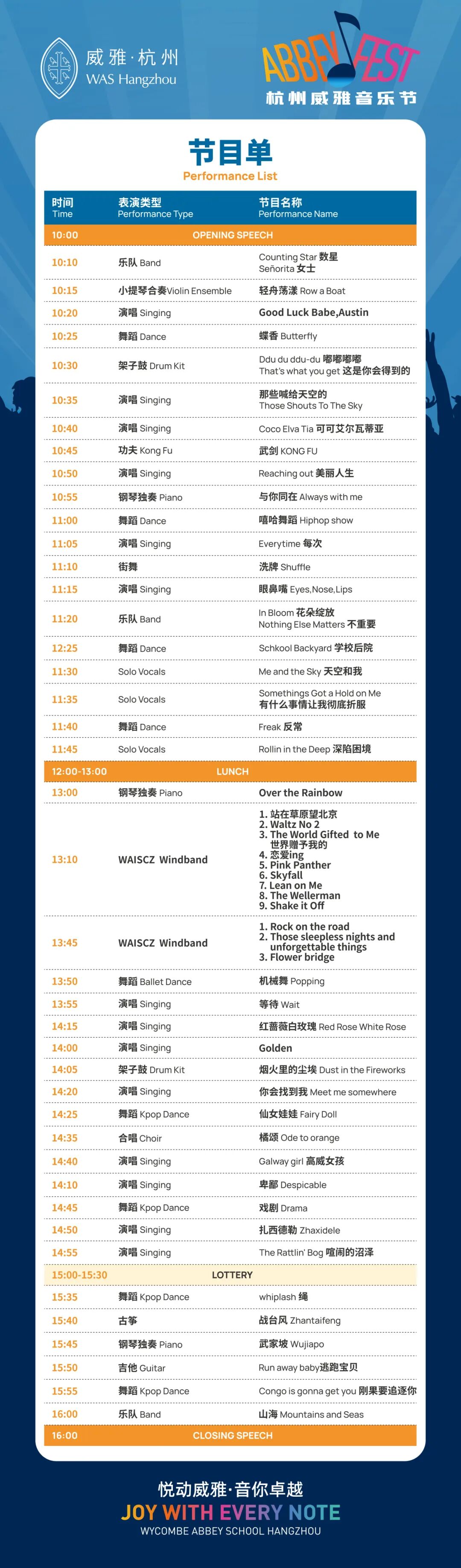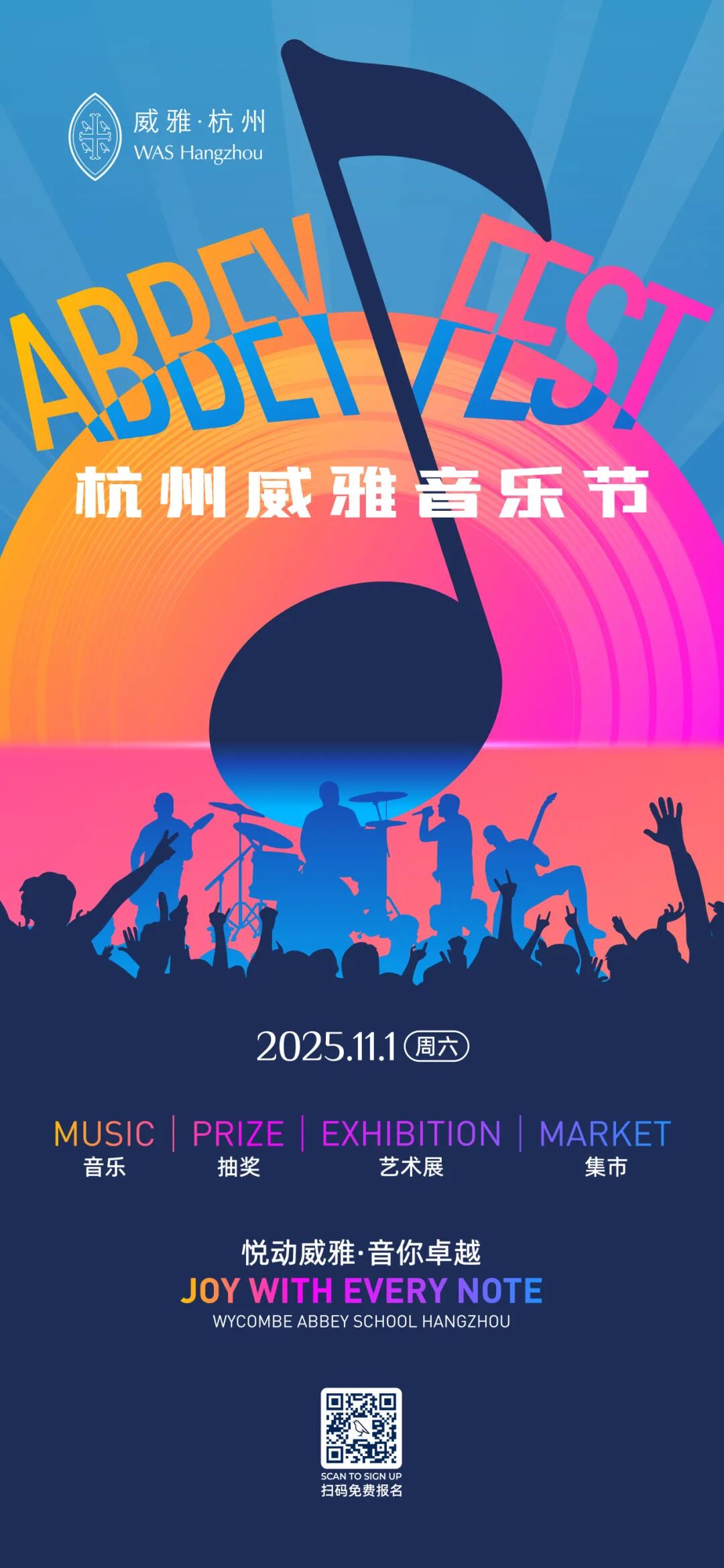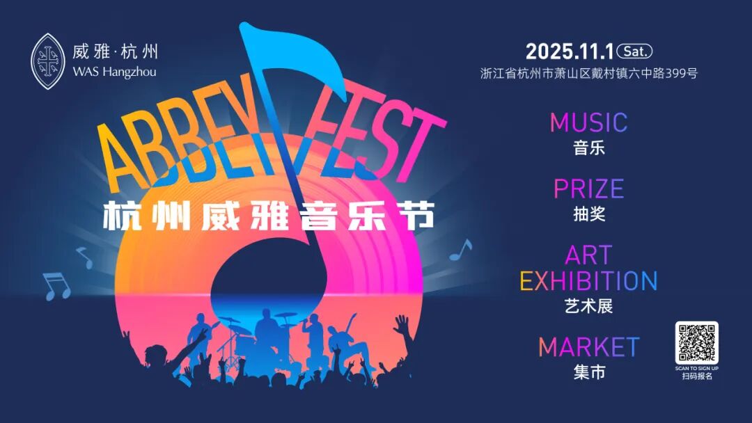 音樂|美食|游戲|抽獎 去年的杭州威雅音樂節 不僅吸引了數百組家庭&3000+人到場 在社交媒體上收獲近50W點贊 在此成功基礎上2025AbbeyFest 歡樂體驗再升級加上難得的好天氣滿足您秋日出游的所有想象 11月1日上午10點 千萬別錯過 史上互動性最強的一次 杭州威雅音樂節 *校門口即可停車 震驚!神秘人士驚現威雅 全校搜尋贏「終極大獎」 音樂節將近,卻有人想在現場「搞點大事」! 懸賞令 據悉,近期將有若干「神秘人士」造訪杭州威雅?,F征集機智過人、觀察敏銳的「小偵探」展開全校大搜查。 事發突然,我們現在只目擊到了「哪吒與敖丙」兩兄弟;其他神秘人僅抓拍到部分特點,只能拜托各位小偵探繼續搜索! 如果你能在音樂節當天找到所有神秘人物,并集齊他們的「專屬徽章」,就有機會贏得「終極賞金」! -免費報名- 「完整節目單」出爐 全員Superstar AbbeyFest的舞臺上沒有「匯報演出」,只有「專業開麥」!杭州威雅的音樂才俊們早已摩拳擦掌,當藝術天分閃耀在聚光燈下,每個人都是「superstar」! -免費報名- 解鎖完美周末 從「趣味市集」開始 音樂節怎么能少了逛吃拍玩?數十個特色市集攤位、豐富有趣的互動游戲、隨處是景的優雅校園,為你解鎖一個完美周末: 美食空降 從網紅小吃到各地風味,味蕾走遍全球。 文創市集 小眾文創、藝術手作、新奇好物,淘件獨一無二的寶貝。 互動游戲 各種游戲、各種運動、各種挑戰,嗨到停不下來?,F場還有幸運抽獎,看大獎究竟花落誰家? 拍照打卡 360°無死角的校園美景。秋日的杭州威雅,張張都是朋友圈大片。 -免費報名- 遍覽200畝森系校園 享受「親子時光」 在體驗過熱鬧的音樂舞臺與趣味市集后,不妨和孩子步行至湖畔草坪,感受秋日閑暇,或穿梭沉浸于學生畫展,體驗學術、人文、藝術相互融合的成長空間。 我們特地準備了眾多親子協作的趣味工作坊和輕松愜意的休憩區域。從共創一幅藝術涂鴉到合作完成一項挑戰,在音樂的環繞中,享受一段高質量陪伴的秋日午后。這將是父母與孩子共同書寫的、獨一無二的溫馨記憶。 -免費報名- 與合作伙伴同行 誠意滿分創意滿分 本次音樂節,我們將與教育、法律、地產、金融等諸多領域的合作伙伴竭誠合作,為大家獻上一場好玩、有料的盛大派對。 11月1日帶上小伙伴與家人準備好尖叫和歡呼來體驗一點不一樣的杭州威雅掃碼免費報名我們不見不散!