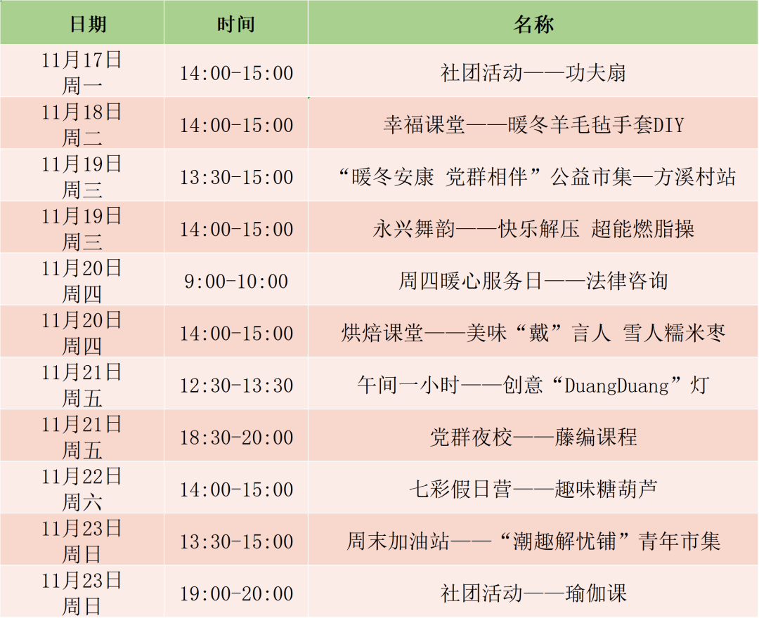 戴村鎮(zhèn)黨群服務(wù)中心11月17日-11月23日活動(dòng)預(yù)告