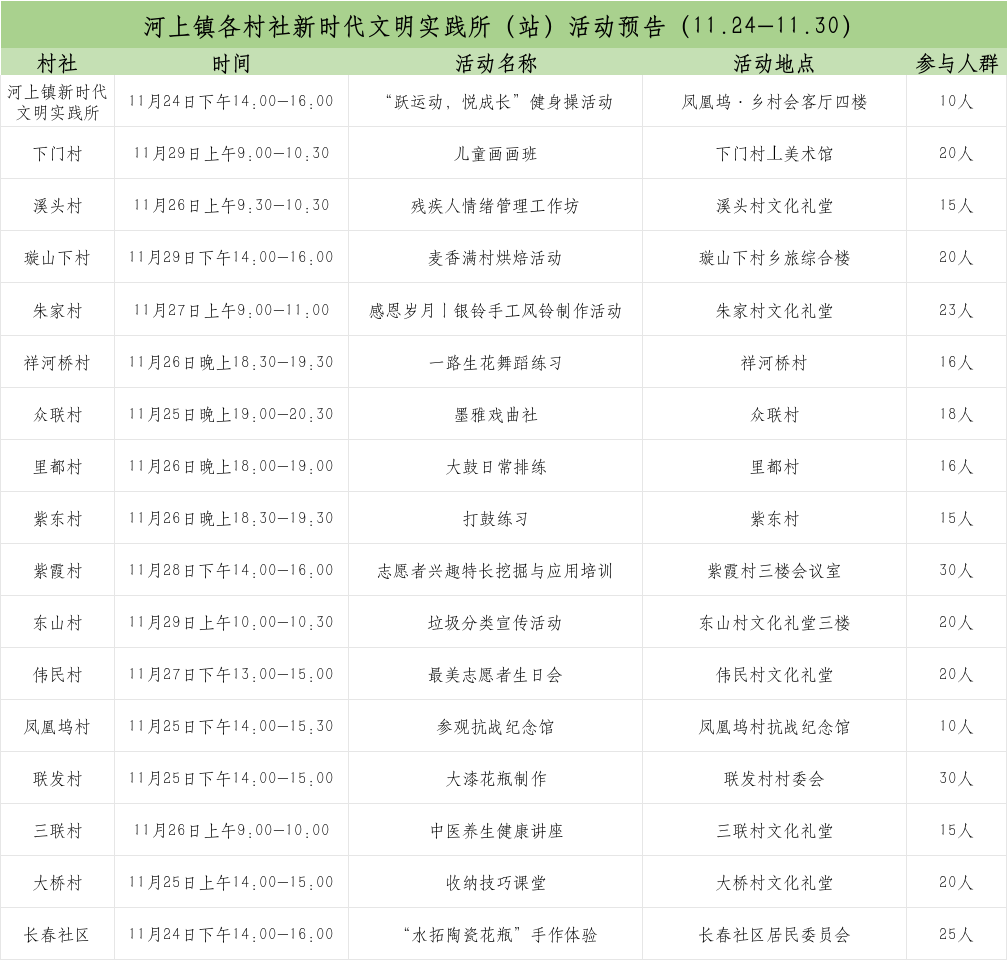 揚帆文明新風,“河”你同行,共赴美好。河上鎮新時代文明實踐所(站)開展了一系列豐富多彩的活動,來看看本周的活動安排,等你來參與!活動預告