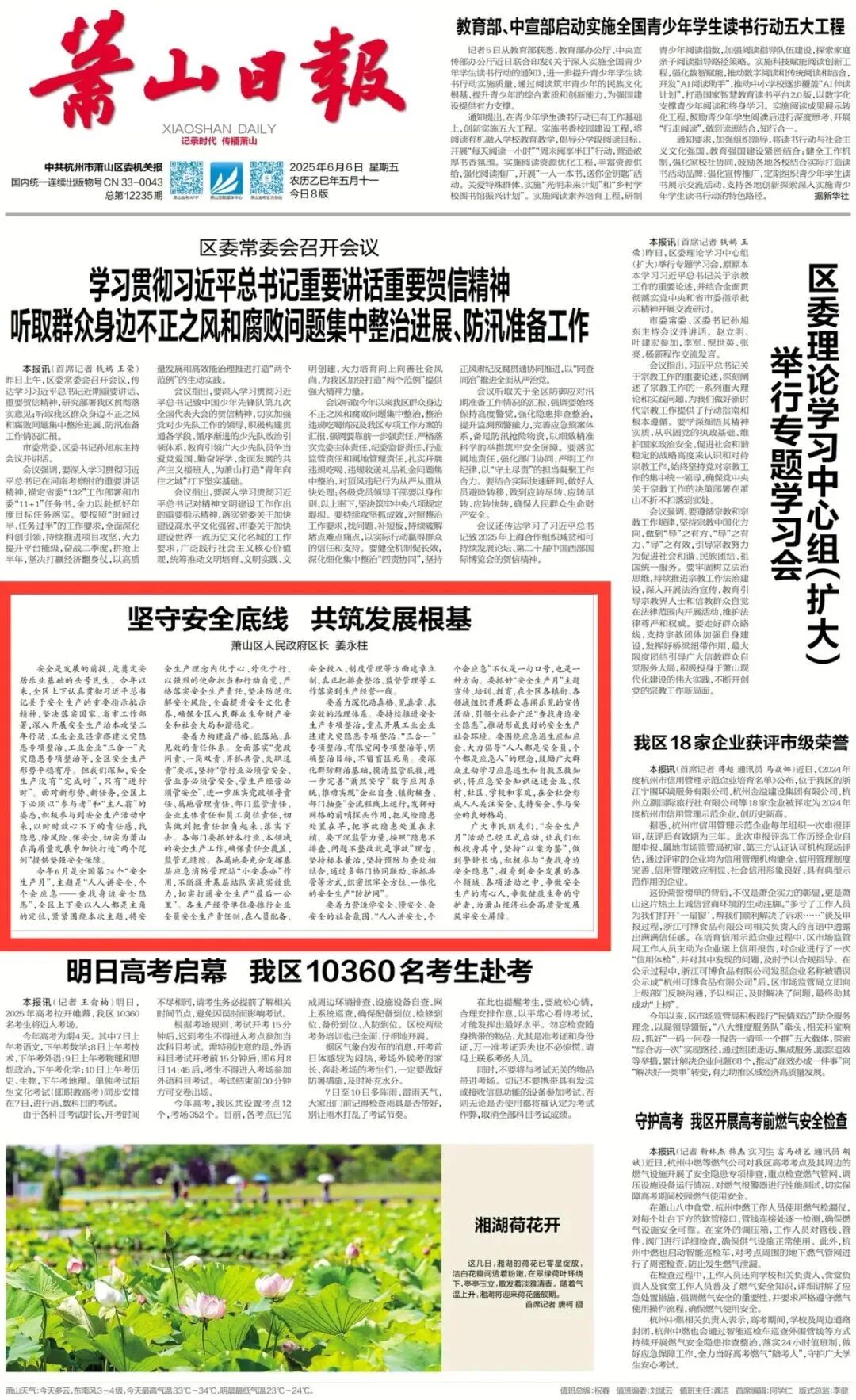今年6月,我們迎來了第24個(gè) 全國(guó)“安全生產(chǎn)月” 日前,區(qū)委副書記、區(qū)長(zhǎng)姜永柱 在蕭山日?qǐng)?bào)頭版發(fā)表署名文章 《堅(jiān)守安全底線共筑發(fā)展根基》 原文如下: 堅(jiān)守安全底線共筑發(fā)展根基 蕭山區(qū)人民政府區(qū)長(zhǎng)姜永柱 安全是發(fā)展的前提,是奠定安居樂業(yè)基礎(chǔ)的頭號(hào)民生。今年以來,全區(qū)上下認(rèn)真貫徹習(xí)近平總書記關(guān)于安全生產(chǎn)的重要指示批示精神,堅(jiān)決落實(shí)國(guó)家、省市工作部署,深入開展安全生產(chǎn)治本攻堅(jiān)三年行動(dòng)、工業(yè)企業(yè)違章搭建火災(zāi)隱患專項(xiàng)整治、工業(yè)企業(yè)“三合一”火災(zāi)隱患專項(xiàng)整治等,全區(qū)安全生產(chǎn)形勢(shì)平穩(wěn)有序。但我們深知,安全生產(chǎn)沒有“完成時(shí)”,只有“進(jìn)行時(shí)”。面對(duì)新形勢(shì)、新任務(wù),全區(qū)上下必須以“參與者”和“主人翁”的姿態(tài),積極參與到安全生產(chǎn)活動(dòng)中來,以時(shí)時(shí)放心不下的責(zé)任感,找隱患、除風(fēng)險(xiǎn)、保安全,切實(shí)為蕭山在高質(zhì)量發(fā)展中加快打造“兩個(gè)范例”提供堅(jiān)強(qiáng)安全保障。 今年6月是全國(guó)第24個(gè)“安全生產(chǎn)月”,主題是“人人講安全,個(gè)個(gè)會(huì)應(yīng)急——查找身邊安全隱患”,全區(qū)上下要以人人都是主角的定位,緊緊圍繞本次主題,將安全生產(chǎn)理念內(nèi)化于心、外化于行,以強(qiáng)烈的使命擔(dān)當(dāng)和行動(dòng)自覺,嚴(yán)格落實(shí)安全生產(chǎn)責(zé)任,堅(jiān)決防范化解安全風(fēng)險(xiǎn),全面提升安全文化素養(yǎng),確保全區(qū)人民群眾生命財(cái)產(chǎn)安全和社會(huì)大局和諧穩(wěn)定。 要著力構(gòu)建最嚴(yán)格、能落地、真見效的責(zé)任體系。全面落實(shí)“黨政同責(zé)、一崗雙責(zé)、齊抓共管、失職追責(zé)”要求,堅(jiān)持“管行業(yè)必須管安全、管業(yè)務(wù)必須管安全、管生產(chǎn)經(jīng)營(yíng)必須管安全”,進(jìn)一步壓實(shí)黨政領(lǐng)導(dǎo)責(zé)任、屬地管理責(zé)任、部門監(jiān)管責(zé)任、企業(yè)主體責(zé)任和員工崗位責(zé)任,切實(shí)做到把責(zé)任擔(dān)負(fù)起來、落實(shí)下去。各部門要抓好本行業(yè)、本領(lǐng)域的安全生產(chǎn)工作,確保責(zé)任全覆蓋、監(jiān)管無縫隙。各屬地要充分發(fā)揮基層應(yīng)急消防管理站“小安委辦”作用,不斷提升基層站隊(duì)實(shí)戰(zhàn)實(shí)效能力,切實(shí)打通安全生產(chǎn)“最后一公里”。各生產(chǎn)經(jīng)營(yíng)單位要推行企業(yè)全員安全生產(chǎn)責(zé)任制,在人員配備、安全投入、制度管理等方面建章立制,真正把排查整治、監(jiān)督管理等工作落實(shí)到生產(chǎn)經(jīng)營(yíng)一線。 要著力深化動(dòng)真格、見真章、求實(shí)效的治理體系。要持續(xù)推進(jìn)安全生產(chǎn)專項(xiàng)整治,重點(diǎn)開展工業(yè)企業(yè)違建火災(zāi)隱患專項(xiàng)整治、“三合一”專項(xiàng)整治、有限空間專項(xiàng)整治等,明確整治目標(biāo),不留盲區(qū)死角。要深化群防群治基礎(chǔ),摸清監(jiān)管底數(shù),進(jìn)一步完善“蕭然安寧”數(shù)字應(yīng)用系統(tǒng),推動(dòng)實(shí)現(xiàn)“企業(yè)自查、鎮(zhèn)街核查、部門抽查”全流程線上運(yùn)行,發(fā)揮好網(wǎng)格的前哨探頭作用,把風(fēng)險(xiǎn)隱患處置在早,把事故隱患處置在末梢。要下沉監(jiān)管力量,按照“隱患不排查、問題不整改就是事故”理念,堅(jiān)持標(biāo)本兼治,堅(jiān)持預(yù)防與查處相結(jié)合,通過多部門協(xié)同聯(lián)動(dòng)、齊抓共管等方式,織密織牢全方位、一體化的安全生產(chǎn)“防護(hù)網(wǎng)”。 要著力營(yíng)造學(xué)安全、懂安全、會(huì)安全的社會(huì)氛圍。“人人講安全,個(gè)個(gè)會(huì)應(yīng)急”不僅是一句口號(hào),也是一種方向。要抓好“安全生產(chǎn)月”主題宣傳、培訓(xùn)、教育,在全區(qū)各鎮(zhèn)街、各領(lǐng)域組織開展群眾喜聞樂見的宣傳活動(dòng),引領(lǐng)全社會(huì)廣泛“查找身邊安全隱患”,推動(dòng)形成良好的安全生產(chǎn)社會(huì)環(huán)境。要圍繞應(yīng)急逃生應(yīng)知應(yīng)會(huì),大力倡導(dǎo)“人人都是安全員,個(gè)個(gè)都是應(yīng)急人”的理念,鼓勵(lì)廣大群眾主動(dòng)學(xué)習(xí)應(yīng)急逃生和自救互救知識(shí),將應(yīng)急安全知識(shí)送進(jìn)企業(yè)、農(nóng)村、社區(qū)、學(xué)校和家庭,在全社會(huì)形成人人關(guān)注安全、支持安全、參與安全的良好格局。 廣大市民朋友們,“安全生產(chǎn)月”活動(dòng)已經(jīng)正式啟動(dòng),讓我們積極投身其中,堅(jiān)持“以案為鑒”,做到警鐘長(zhǎng)鳴,積極參與“查找身邊安全隱患”,投身到安全發(fā)展的各個(gè)領(lǐng)域、各項(xiàng)活動(dòng)之中,爭(zhēng)做安全生產(chǎn)的有心人,爭(zhēng)做健康生命的守護(hù)者,為蕭山經(jīng)濟(jì)社會(huì)高質(zhì)量發(fā)展筑牢安全屏障。