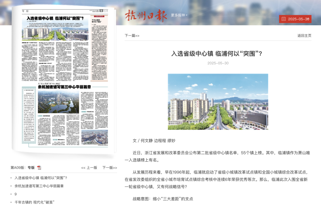 《杭州日報(bào)》聚焦報(bào)道:《入選省級(jí)中心鎮(zhèn) 臨浦何以“突圍”?》