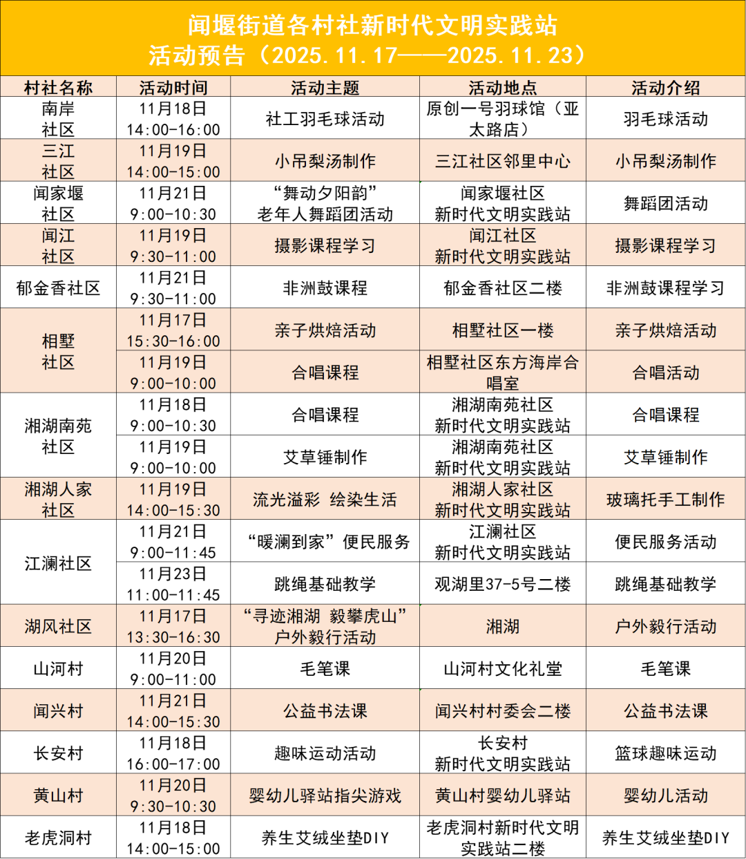 為深入開展新時代文明實踐活動 進一步服務群眾、便利群眾 聞堰街道新時代文明實踐站 推出系列精彩活動 下周新時代文明實踐活動預告 速來get! 能量團活動報名 進入下方鏈接即可報名下期活動 能量團志愿者報名 親愛的居民:聞堰街道村社能量團志愿者開始招募啦!若您有一技之長,或滿懷愛心,歡迎加入——可授課、做便民服務、參與志愿活動,用微光聚暖,共筑溫馨村社,盼您來! 本周活動精彩回顧 湘湖人家社區、湖風社區 湘湖人家社區新時代文明實踐站與湖風社區新時代文明實踐站攜手開展文化走親活動,以繪畫藝術為橋梁,為居民開啟了一場別樣的藝術療愈之旅。活動現場設置了自由創作與蒙眼體驗兩大環節,讓居民們在多元形式中感受藝術魅力。自由創作環節里,居民們手持畫筆將生活感悟、美好期許融入筆尖,在色彩與線條的交織中釋放壓力、舒緩心靈。蒙眼感受環節中,居民們在黑暗中專注感知身體的每一處反應,在沉靜中與自我對話,收獲別樣體驗。現場縈繞著歡聲笑語,鄰里間不時交流創作思路、分享內心感受,暖意十足。此次活動不僅緊密了兩社區間的文化聯結,更以藝術之力為居民搭建了情感抒發的專屬平臺,讓溫暖在交流中持續傳遞。 聞家堰社區 聞家堰社區新時代文明實踐站在轄區內兩個小區分別成功舉辦了兩場便民服務活動。活動聚焦居民日常需求,匯聚了理發、義診、磨刀、修褲腳、法律咨詢以及“書記接待日”等多項貼心服務。現場氣氛熱烈,各個服務點位前都聚集了不少居民。志愿者們技藝嫻熟,服務周到;醫務工作者耐心檢查并給出健康建議;律師和社區書記則認真聆聽居民訴求,解答疑難。此次活動將實實在在的便利送到了居民“家門口”,不僅有效解決了居民的生活小難題,更拉近了鄰里關系,提升了社區的凝聚力與歸屬感,收獲了居民的一致好評。 湘湖南苑社區 湘湖南苑社區新時代文明實踐站組織的合唱課溫暖開唱。課堂上,居民們率先以練氣、音階練習開啟熱身,專業指導老師針對氣息調控的穩定性、音階演唱的音準把握等問題逐一示范指導。隨著練習推進,大家的狀態漸入佳境,默契度也不斷提升。隨后,居民們跟隨老師的鋼琴彈奏,投入合唱曲目《我和我的祖國》的排練,課堂氛圍輕松而融洽。此次合唱課不僅讓居民們學習了發聲技巧、提升了合唱默契,更在旋律與歌聲中收獲了滿滿的快樂,增進了彼此間的情誼。 聞江社區 聞江社區新時代文明實踐站組織開展攝影課教學,本次課程聚焦“日常場景光影捕捉”核心主題,特別邀請專業攝影師現場授課。課堂上,老師先通過理論講解細致拆解構圖技巧、曝光調節等實用知識,結合日常場景案例分析,讓居民快速理解核心要點。理論結束后,課程轉入戶外實操環節,居民們手持手機積極投入實踐,遇到拍攝難題時主動向老師請教,或是鄰里間交流心得、分享拍攝思路。大家在光影中探索創作,用鏡頭記錄身邊的美好瞬間,現場氛圍熱烈而溫馨。此次課程不僅幫助居民解鎖了手機攝影新技能,更搭建了鄰里間交流學習的平臺,讓大家在共同探索中收獲了知識與快樂,進一步豐富了社區文化生活。