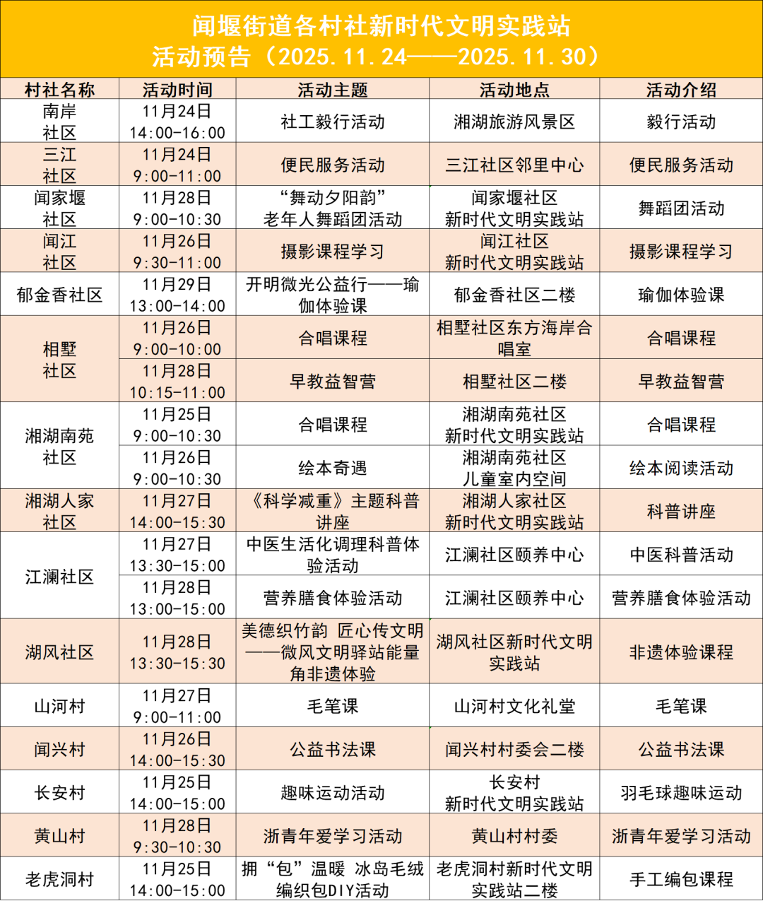 為深入開展新時代文明實踐活動 進一步服務群眾、便利群眾 聞堰街道新時代文明實踐站 推出系列精彩活動 下周新時代文明實踐活動預告 速來get! 能量團活動報名 進入下方鏈接即可報名下期活動 能量團志愿者報名 親愛的居民:聞堰街道村社能量團志愿者開始招募啦!若您有一技之長,或滿懷愛心,歡迎加入——可授課、做便民服務、參與志愿活動,用微光聚暖,共筑溫馨村社,盼您來! 本周活動精彩回顧 湘湖人家社區 湘湖人家社區新時代文明實踐站組織開展毛氈手套DIY主題活動,為居民開啟了一場兼具創意與溫情的冬日暖心之旅。活動現場氛圍溫馨濃厚,在專業手工老師的細致指導下,居民們有序挑選心儀面料、構思獨特圖案、專注裁剪縫制。大家時而交流針法技巧,時而分享設計靈感,在一針一線的細膩創作中感受手工藝術的獨特魅力。經過一個多小時的潛心制作,每一位參與者都完成了獨具個性的毛氈手套,將冬日暖意與生活美好融入手作之中。此次活動不僅讓居民們解鎖了手工新技能,更以手作之橋搭建了鄰里溝通的溫馨平臺,讓鄰里情誼在協作中愈發深厚,讓和諧友愛的氛圍在居民心間持續傳遞。 南岸社區 南岸社區新時代文明實踐站依托嬰幼兒驛站平臺,開展親子繪本主題活動,以經典繪本《棕色的熊,棕色的熊,你在看什么?》為紐帶,為轄區嬰幼兒家庭開啟了一場兼具趣味啟蒙與溫情陪伴的親子悅讀之旅。親子共讀環節中,家長們通過模仿動物叫聲、互動提問等趣味形式,引導孩子們積極猜測下一個出場的動物;主題涂鴉環節里,孩子們手持油畫棒,專注為空白的動物圖案涂色創作,在一筆一畫的細致涂色過程中,展現出天馬行空的創造力,活動現場洋溢著溫馨歡樂的氛圍。此次親子繪本活動以多元互動形式,既為親子互動搭建了優質交流平臺,更豐富了親子互動形式,陪伴孩子們在快樂中健康成長。 湘湖南苑社區 湘湖南苑社區新時代文明實踐站組織開展艾草養生錘手工制作主題活動。在知識講解環節中,專業老師結合中醫養生理念,詳細闡釋了艾草驅寒除濕、溫經通絡的傳統功效,系統介紹了人體常見穴位的定位與按摩技巧,并通過現場示范指導居民如何正確使用養生錘進行日常保健。手工制作環節里,在老師的細致指導下,大家有條不紊地進行加中藥、鋪艾草、包裹布料、纏繞棉線等操作步驟。鄰里間相互切磋技巧、主動提供幫助,有的分享養生小妙招,有的交流布料選擇心得。經過一番精心制作,一個個造型精致、散發著艾草清香的養生錘相繼誕生。此次活動不僅讓居民們掌握了簡單有效的保健方法,更傳播了科學健康的生活理念,豐富了居民的精神文化生活。 江瀾社區 江瀾社區新時代文明實踐站聯合糖糕烘焙機構,開展“花束蛋糕DIY甜蜜中悟美德”主題活動,讓孩子們在沉浸式體驗中收獲知識與成長。活動由糖糕烘焙的婷婷老師全程指導,從食材稱量、面糊攪拌到裱花裝飾,一步步耐心講解操作要領與技巧。孩子們化身“小小烘焙師”,專注地跟著老師的步驟有條不紊地操作,時而相互協作傳遞工具,時而分享裱花創意,在動手實踐中感受烘焙藝術的獨特魅力。同時美德分享環節巧妙穿插其中,社區工作人員結合活動場景引導孩子們踐行傳統美德,讓孩子們在實踐中潛移默化地領悟謙讓有禮、勤儉節約的美德內涵。 老虎洞村 老虎洞村新時代文明實踐站組織開展養生艾絨坐墊DIY主題活動?;顒右潦迹蠋熃Y合中醫養生理念,詳細闡釋了艾絨溫經散寒、祛濕止痛的傳統功效,系統分享了艾絨在日常保健中的應用場景與實用價值。隨后的手工制作環節里,村民們在老師的指導下,有條不紊地進行揉絨填充、穿針縫合、細節打磨等操作步驟。過程中,村民們互幫互助,有的耐心指導新手掌握縫合針法,有的主動分享填充艾絨的均勻技巧,大家將對健康的期許與對生活的熱愛融入每一針一線,在指尖流轉間把養生理念與真摯心意縫進坐墊之中。此次活動將傳統養生知識普及與手工實踐結合,不僅讓村民們解鎖了養生新技能,親手制作了實用的養生好物,更傳播了科學健康的生活理念,搭建了鄰里互動交流的溫馨平臺。