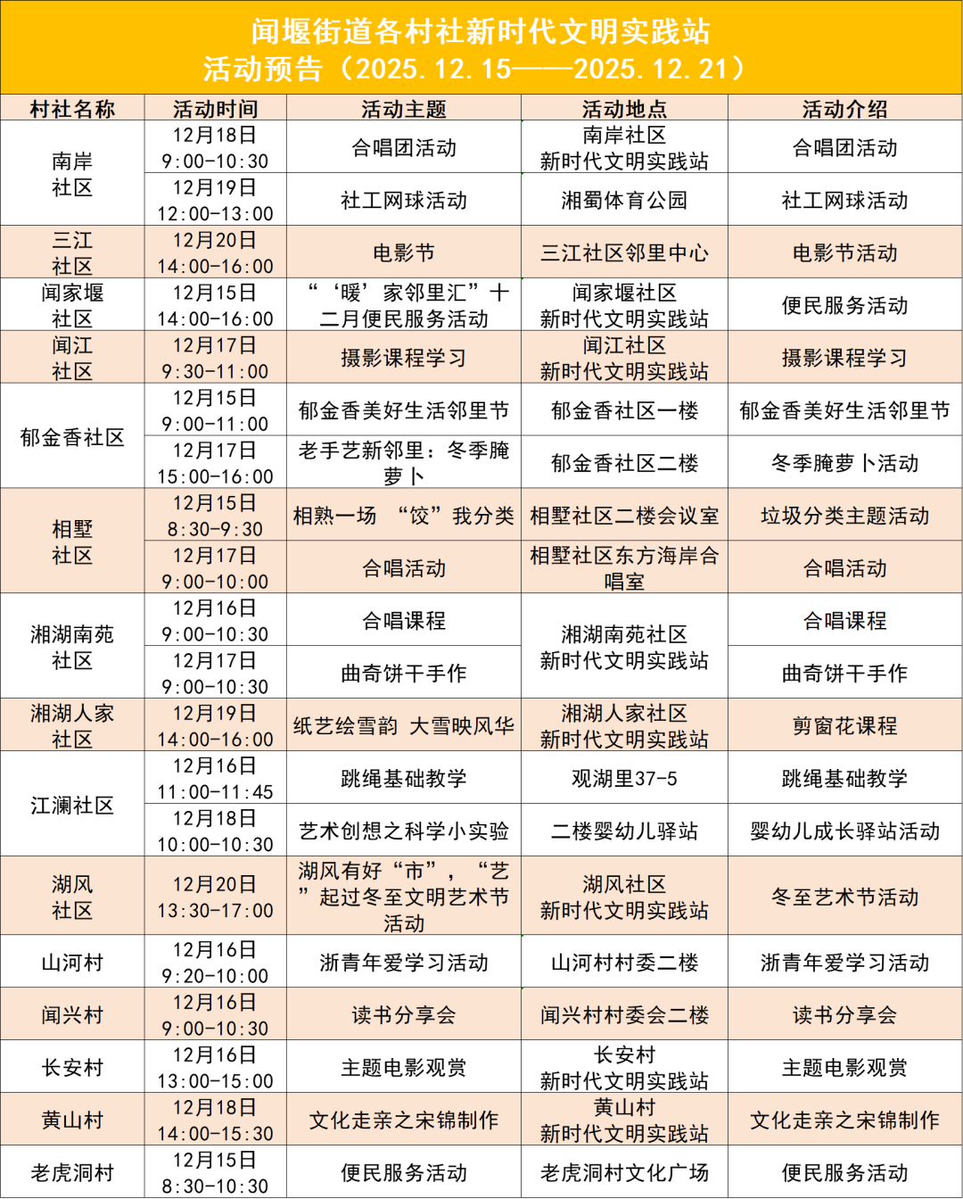 為深入開展新時代文明實踐活動 進一步服務群眾、便利群眾 聞堰街道新時代文明實踐站 推出系列精彩活動 下周新時代文明實踐活動預告 速來get! 能量團活動報名 進入下方鏈接即可報名下期活動 能量團志愿者報名 親愛的居民:聞堰街道村社能量團志愿者開始招募啦!若您有一技之長,或滿懷愛心,歡迎加入——可授課、做便民服務、參與志愿活動,用微光聚暖,共筑溫馨村社,盼您來! 本周活動精彩回顧 湘湖人家社區 湘湖人家社區新時代文明實踐站舉辦“宋錦織心意·駿馬載情歸”傳統手工藝體驗活動。本次活動以傳承非物質文化遺產為契機,讓居民們在指尖流轉中感受宋錦這一中華傳統織造技藝的獨特魅力。活動伊始,老師首先為大家介紹了宋錦的歷史淵源與文化價值、宋錦的織造工藝等知識。進入實踐環節,居民們聚焦宋錦小馬掛件的制作展開實操。從紋樣甄選、布料剪裁,到針法研習、拼接縫制,大家凝神專注,將各色宋錦布料巧妙搭配、精細縫合,一件件形態各異、栩栩如生的小馬掛件逐漸成型。此次活動不僅讓居民們深入領略了宋錦非遺技藝的魅力,更以非遺傳承為紐帶,豐富了社區文化生活,讓鄰里溫情在匠心傳承中持續傳遞。 聞家堰社區 聞家堰社區新時代文明實踐站舉辦“銀齡舞韻情系新疆”老年舞蹈排練活動。活動現場,老年居民們伴隨悠揚的樂聲翩翩起舞,專注學習新疆舞獨有的韻律特點與步伐技巧。專業指導老師針對舞蹈動作的協調性、節奏卡點的精準度等細節逐一示范點撥,幫助大家快速掌握動作要領。隨著排練的推進,居民們的舞姿愈發舒展流暢,舞蹈走位配合也愈發默契。此次活動不僅為老年居民們提供了愉悅身心的文娛平臺,更讓大家沉浸式體驗了新疆民族文化的魅力,以舞蹈為紐帶,拉近了鄰里之間的距離。 湘湖南苑社區 湘湖南苑社區新時代文明實踐站在兒童室內活動空間舉辦了一場趣味盎然的繪本閱讀活動。活動中,空間主理人、咪子教育的朱老師帶著經典繪本《好餓的毛毛蟲》開展生動有趣的講解課程。朱老師以繪聲繪色的講述搭配生動形象的肢體動作,將毛毛蟲從破卵而出到啃食蔬果、最終破繭成蝶的成長過程鮮活再現。孩子們聽得專注,不時積極舉手提問、分享自己的觀察與想法,現場互動溫馨而愉快。此次繪本閱讀活動不僅讓孩子們在趣味故事中直觀感受生命成長的奇妙,更有效激發了他們的閱讀興趣與想象力,為社區兒童打造了充滿童趣與溫度的精神樂園。 三江社區 三江社區新時代文明實踐站舉辦“毛絨紙巾盒”手作活動,以趣味手工為紐帶,為居民開啟了一場充滿創意與溫情的手工體驗之旅。活動現場,專業指導老師率先為大家細致拆解從布料裁剪、針線縫制到裝飾點綴的完整制作流程,隨后,居民們親手實踐,將柔軟的毛絨布料與實用紙巾盒巧妙結合,在一針一線的穿梭中注入巧思與心意,賦予普通物件獨特的個性與溫度,過程中,鄰里間不時交流制作技巧、分享創意靈感,現場氛圍輕松而溫馨。此次活動不僅讓居民們體驗了手工創作的樂趣、鍛煉了動手能力,更以趣味手作拉近了鄰里距離,豐富了社區精神文化生活,讓溫暖與創意在指尖流轉、在社區傳遞。 郁金香社區 郁金香社區新時代文明實踐站開展非洲鼓社團專項排練活動,本次活動聚焦經典曲目《愛我中華》展開系統學習。活動現場,專業指導老師率先對曲目核心節奏進行拆解,針對鼓點敲擊的力度把控、節奏銜接的流暢性等要點逐一示范講解。居民們從基礎單音練習入手,循序漸進過渡到合曲配合,在反復練習中逐步掌握了曲目的韻律變化和節奏要點。隨著排練推進,大家的演奏愈發整齊默契,鏗鏘有力的鼓點此起彼伏。此次活動不僅幫助居民們掌握了基礎的非洲鼓演奏技巧,增強了團隊協作能力,更以特色文化活動豐富了社區精神文化生活。