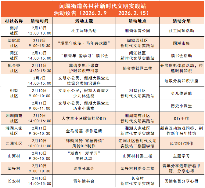為進一步深化新時代文明實踐 傳播文明新風 聞堰街道持續深耕群眾需求 精心籌備系列豐富活動 在這里,既有思想碰撞的智慧火花 也有愛心傳遞的溫暖瞬間 既有文化浸潤的詩意時光 更有鄰里相聚的真摯情誼 超多驚喜!等你來發現 下周活動預告 能量團活動報名 進入下方鏈接即可報名下期活動 能量團志愿者報名 親愛的居民:聞堰街道村社能量團志愿者開始招募啦!若您有一技之長,或滿懷愛心,歡迎加入——可授課、做便民服務、參與志愿活動,用微光聚暖,共筑溫馨村社,盼您來!