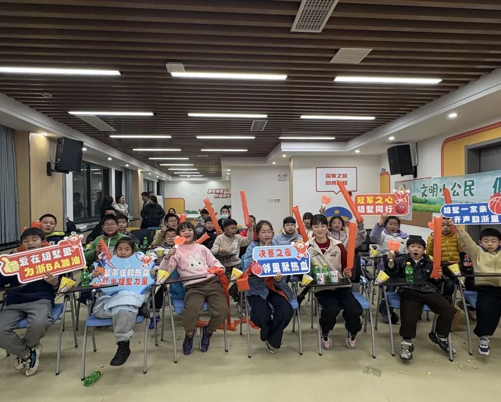 2月4日晚,社區多功能廳沒有黑板,也沒有課桌。五十多個孩子圍坐大屏前,目光緊鎖浙BA總決賽的每一記投籃。這是“假期大課堂”里最特別的一節——沒有主講人,但每一位大學生志愿者都是引導者。