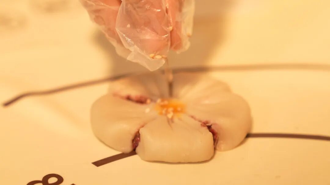 壓出花瓣形狀,表面點綴幾粒芝麻